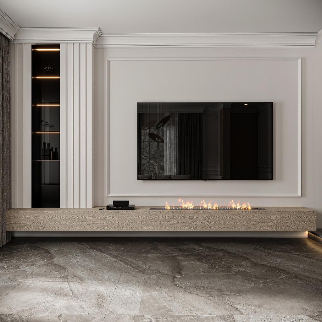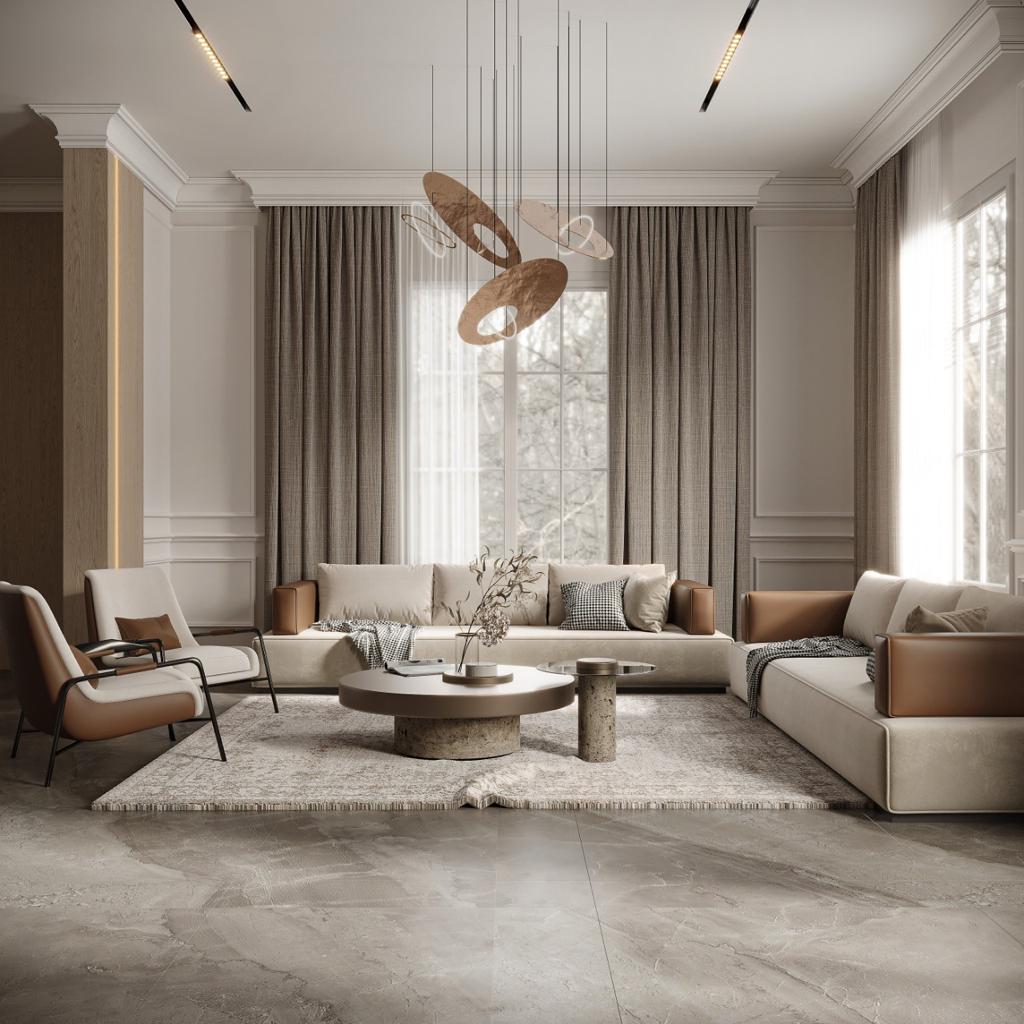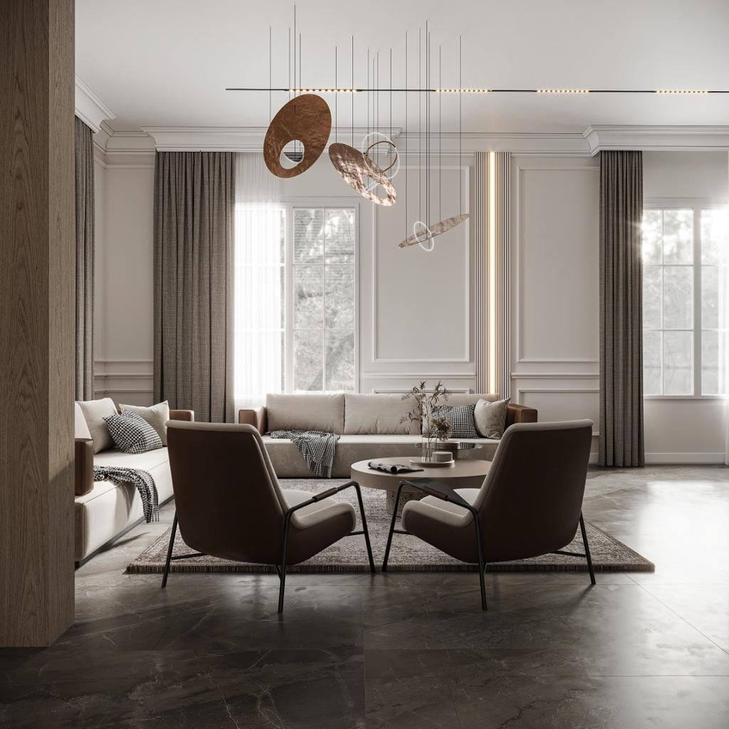 This residential living room project combines elegant French design with a modern touch. The refined wall lines reflect a classic French aesthetic, seamlessly blended with contemporary furniture. The color scheme features warm, monochromatic tones, complemented by earthy flooring that enhances the cozy yet sophisticated atmosphere of the room. The design balances timeless elegance with modern comfort, creating a welcoming and stylish living space.