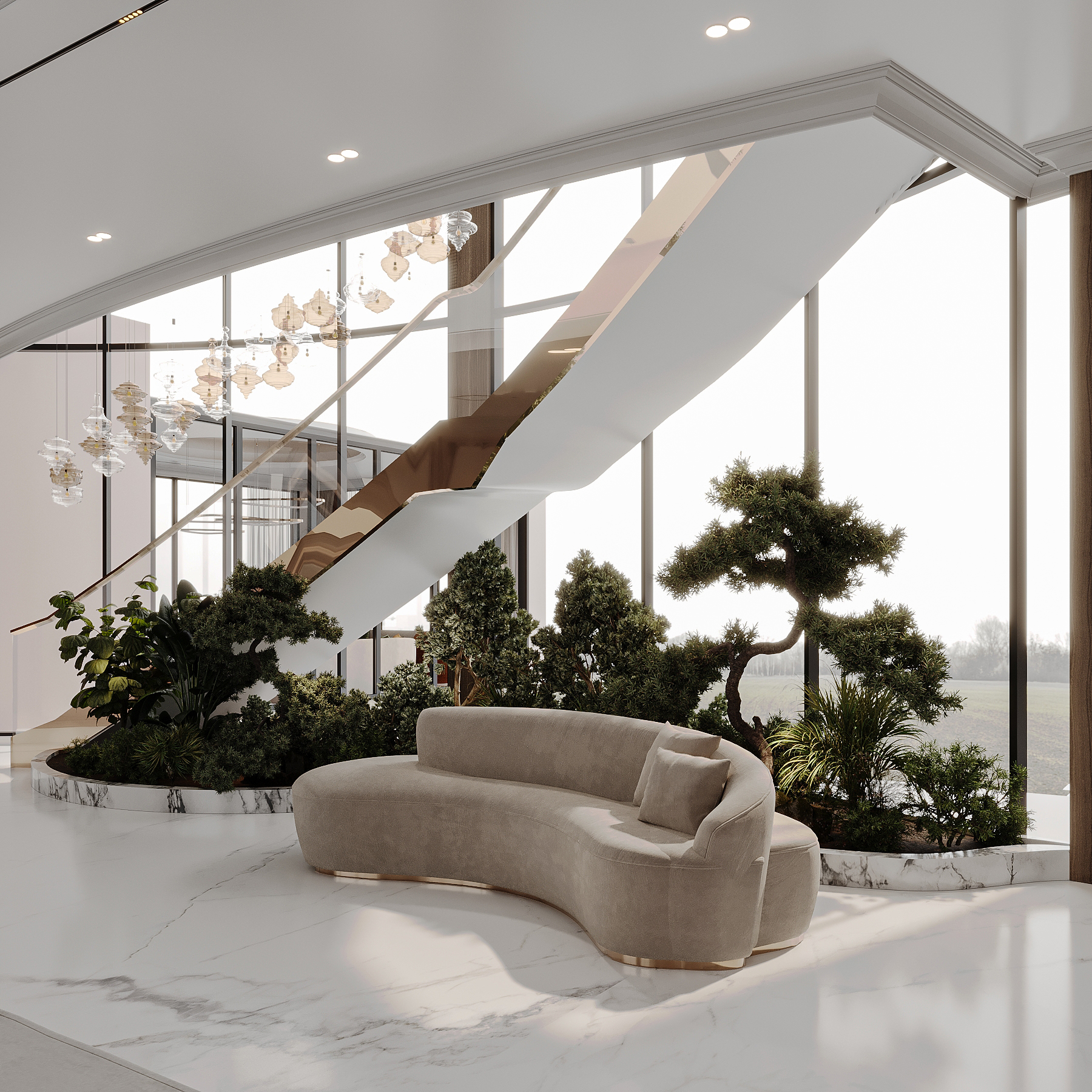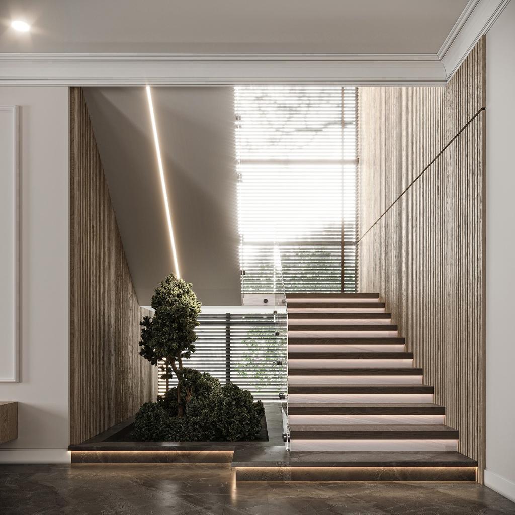 To introduce an organic element, greenery is integrated at the center of the staircase, adding vibrancy and a connection to nature. Tall indoor plants are carefully placed in neutral-toned planters. A minimalist indoor garden with white pebbles and low-maintenance plants may also be included to enhance the serene, Zen-like ambiance.