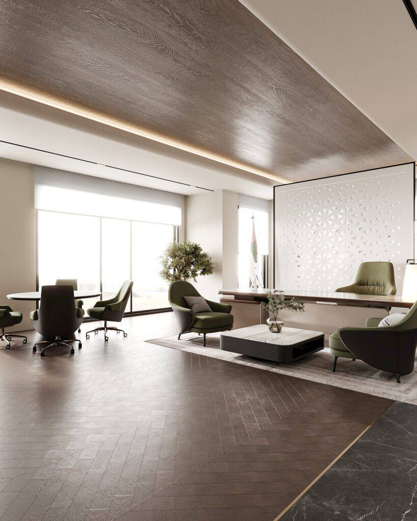 The executive offices at Abu Dhabi Airport are designed with a modern and sophisticated aesthetic, combining functionality with elegance. A harmonious color palette is used, blending rich earthy browns, deep greens, and soft monochromatic tones to create a refined and professional atmosphere.
