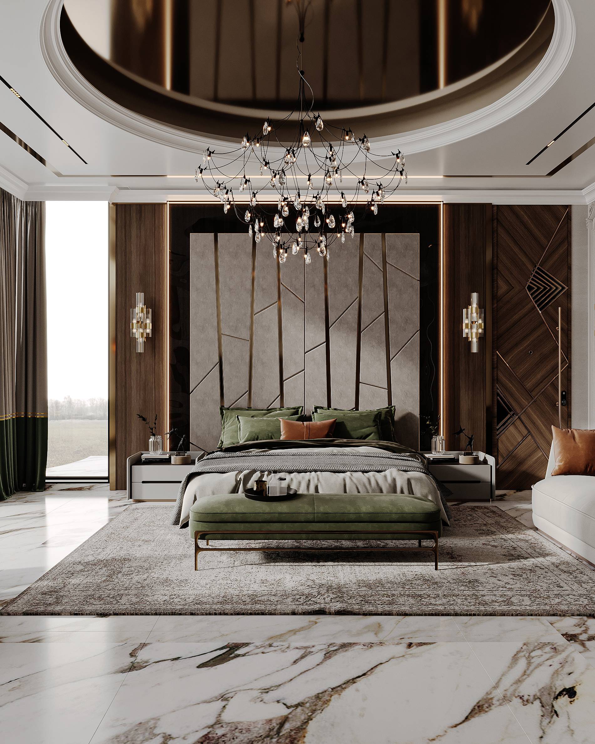 This master bedroom blends classic design with modern New Classic style, creating a sophisticated and timeless atmosphere. The use of matte copper accents, combined with warm wood and sleek black marble, adds a luxurious touch to the space. The design harmoniously merges traditional elegance with contemporary elements, resulting in a refined and opulent environment perfect for relaxation.