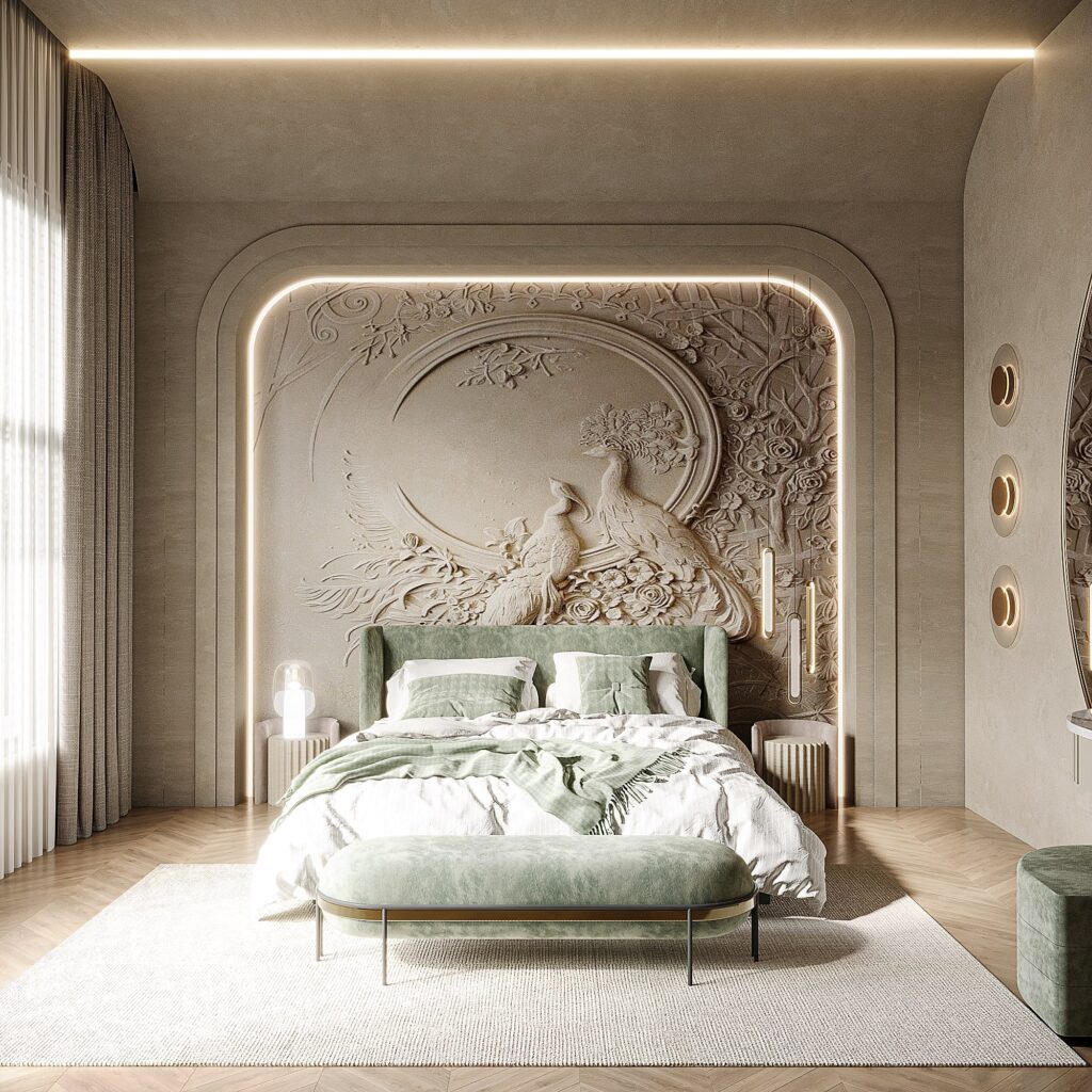 The new classic bedroom combines elements of both classic and modern styles, creating a timeless and sophisticated atmosphere. A unique feature of the design is the innovative wall mirror.